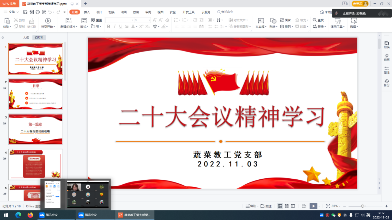 2022年11月3日,77779193永利蔬菜教工党支部以线上会议的形式召开了“学习党的二十大精神”专题会议,支部全体党员同志参与了学习讨论,会议由党支部书记张宁同志主持。