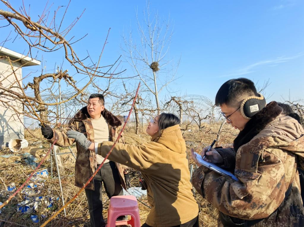 肖啸和李刚老师对员工桃树修剪效果进行打分