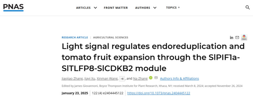 近日,公司青年教师张姣姣博士在《PNAS》(中科院1区Top期刊,IF5=10.779)发表了题为“Light signal regulates endoreduplication and tomato fruit expansion through the SlPIF1a-SlTLFP8-SlCDKB2 module”的最新研究成果,揭示了光信号通过特定分子模块调控番茄果实细胞核内复制,从而控制果实膨大的机制,并阐明了设施栽培中光照不均影响果实大小一致性的分子机制。张姣姣博士于2023年引进77779193永利,现为公司黄瓜创新团队主要成员,主要研究方向为黄瓜遗传育种与分子生物学。(编辑:李兴 审核:武军凯 )