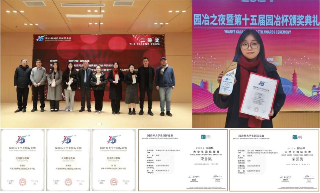 此外,刘雨欣(《龙行之潭,唤醒焕新——基于城市更新理念下的保定市龙潭公园景观规划设计》,由张锐指导)和韩颖(《津冀海岸带生态安全格局变化研究》,由蔡鸿昌指导)两位同学的参赛作品分别荣获本届园冶杯竞赛的毕业设计荣誉奖和毕业论文荣誉奖。学院和各位指导老师对竞赛的大力支持也获得了组委会的认可,将公司评为“第十五届园冶杯老员工国际竞赛先进教育集体”,并授予公司“第十五届园冶杯老员工国际竞赛优秀组织奖”,授予朱建佳、蔡鸿昌、张磊三位老师“优秀指导教师”奖。