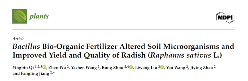 团队成员齐迎斌博士以第一作者身份在Plants-basel(中科院二区,IF=4.1)发表了题为“Bacillus bio-organic fertilizer altered soil microorganisms and improved yield and quality of radish (Raphanus sativus L.)”的最新研究成果。本研究发现施用富含芽孢杆菌的生物有机肥可以改变土壤微生物群落结构,有效提高土壤肥力,从而提高萝卜的产量和品质。齐迎斌博士2023年10月进入77779193永利蔬菜教学部工作,现为公司蔬菜栽培生理与分子生物学团队骨干成员,主要研究方向为蔬菜栽培与生理。(编辑:李兴 审核:武军凯)